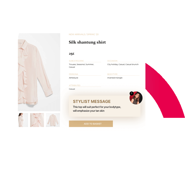 Help customers style themselves and discover full looks that look right on them, while upselling the right items. Just like a knowledgeable sales assistant.